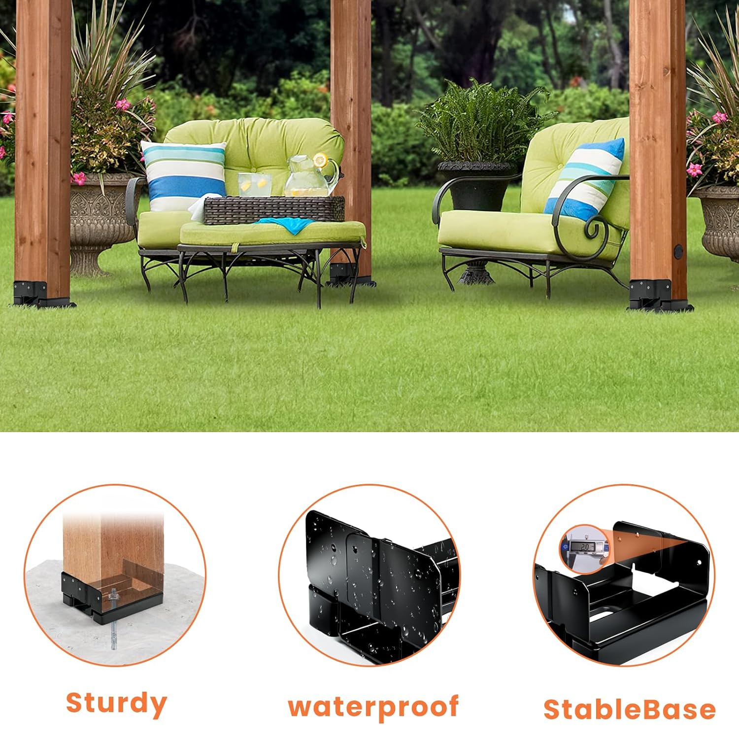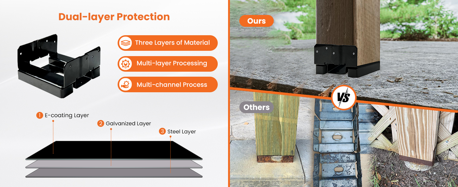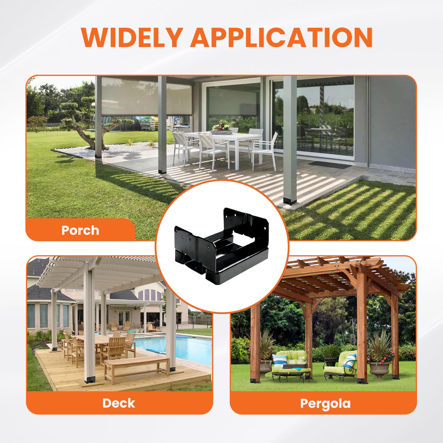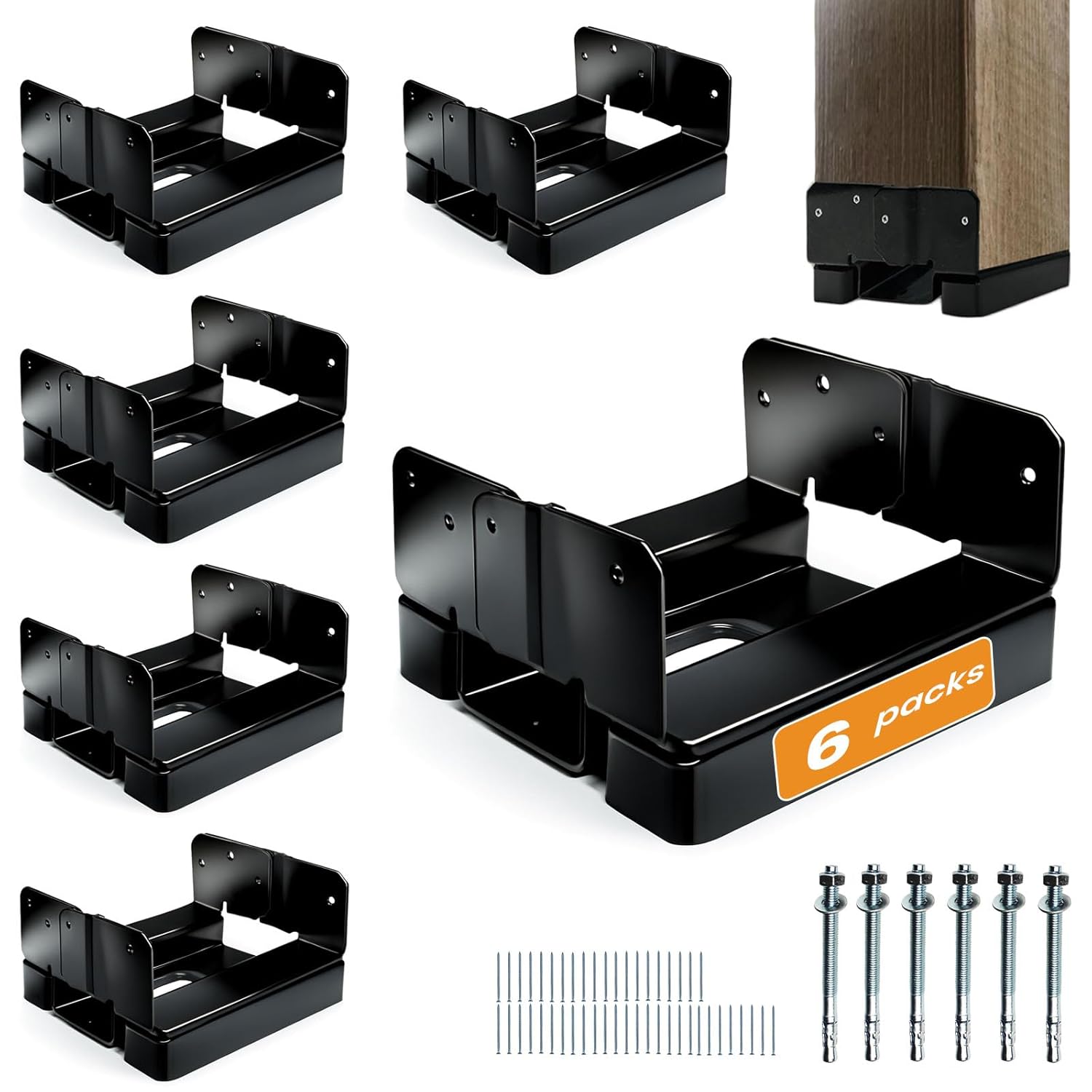 • 𝐂𝐨𝐫𝐫𝐨𝐬𝐢𝐨𝐧-𝐫𝐞𝐬𝐢𝐬𝐭𝐚𝐧𝐭 𝐄-𝐜𝐨𝐚𝐭𝐢𝐧𝐠: Each 6×6 post bracket is coated with black e-coating and galvanization,providing superior corrosion resistance and rust prevention.This dual-layer protection ensures a long lifespan while significantly reducing maintenance and replacement frequency.
