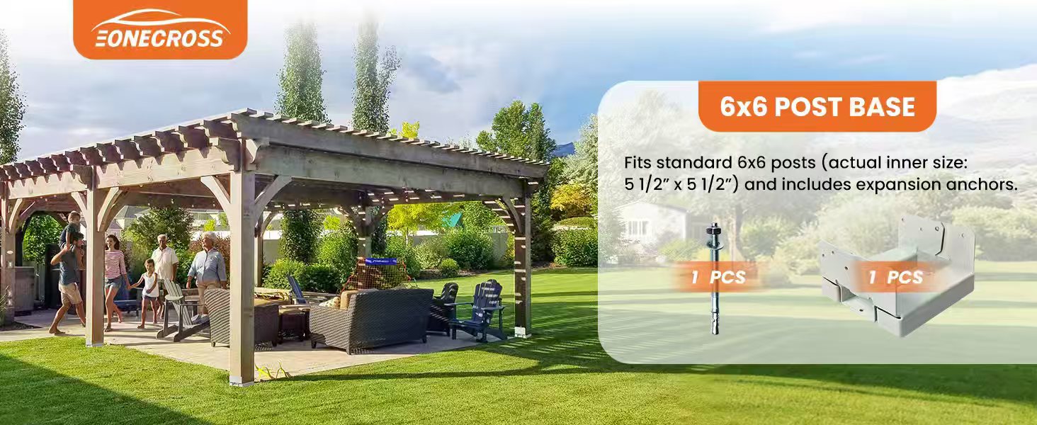 - 𝐔𝐧𝐢𝐪𝐮𝐞 𝐃𝐞𝐬𝐢𝐠𝐧 & 𝐄𝐚𝐬𝐲 𝐈𝐧𝐬𝐭𝐚𝐥𝐥𝐚𝐭𝐢𝐨𝐧: Compared with other 6×6 post anchors,our post anchor features a 1″ standoff from the ground,effectively preventing rot and infestation.Additionally,the adjustable level design of our 6×6 pergola bracket kit makes installation easier,saveing time and effort.