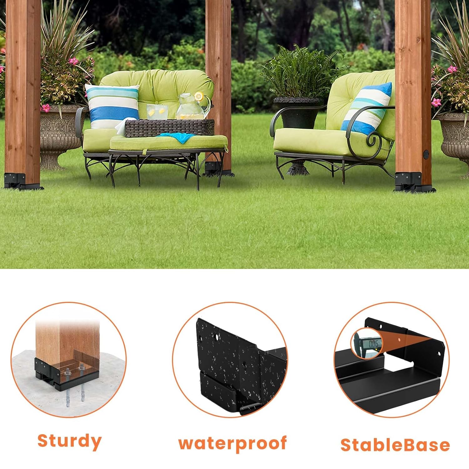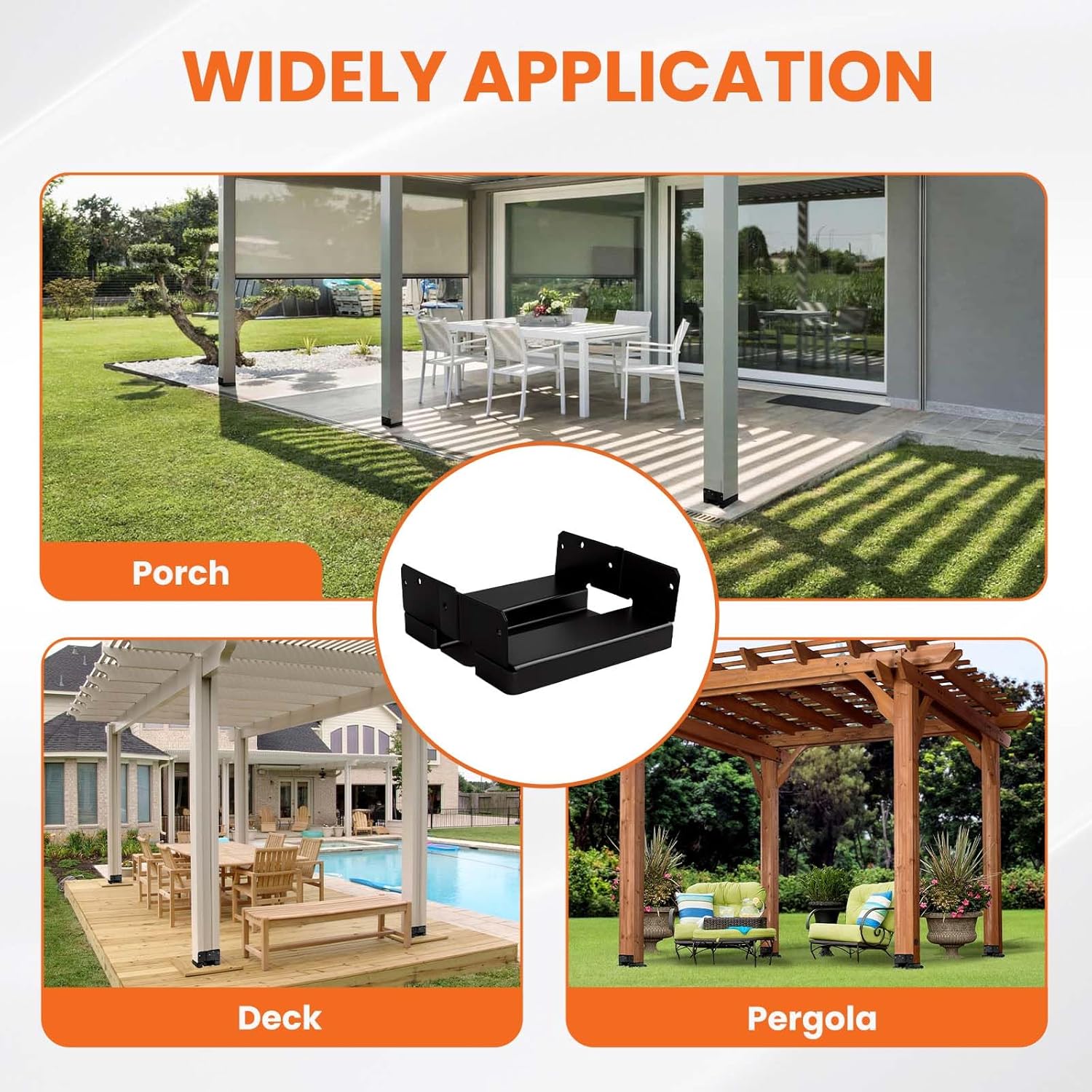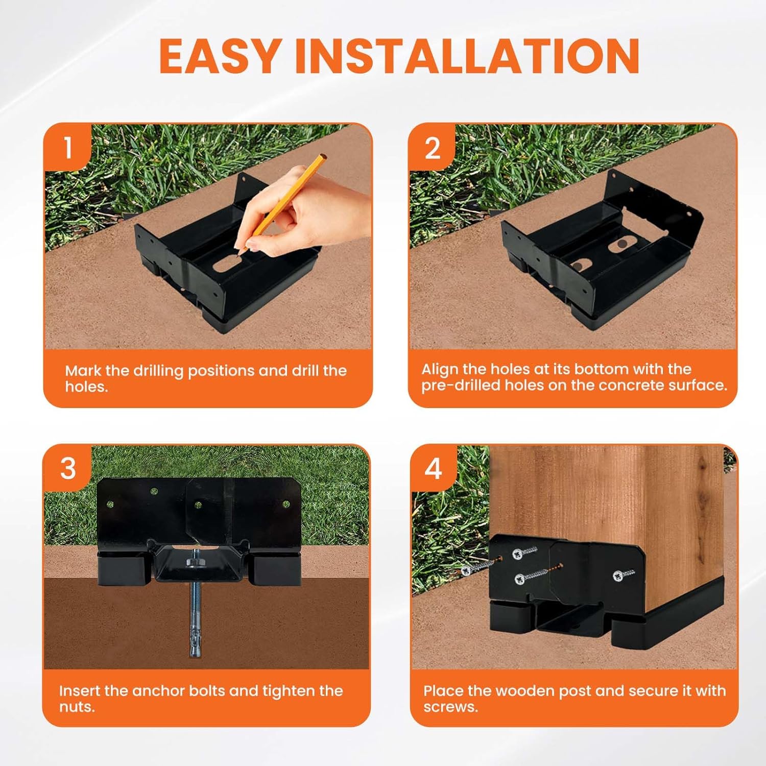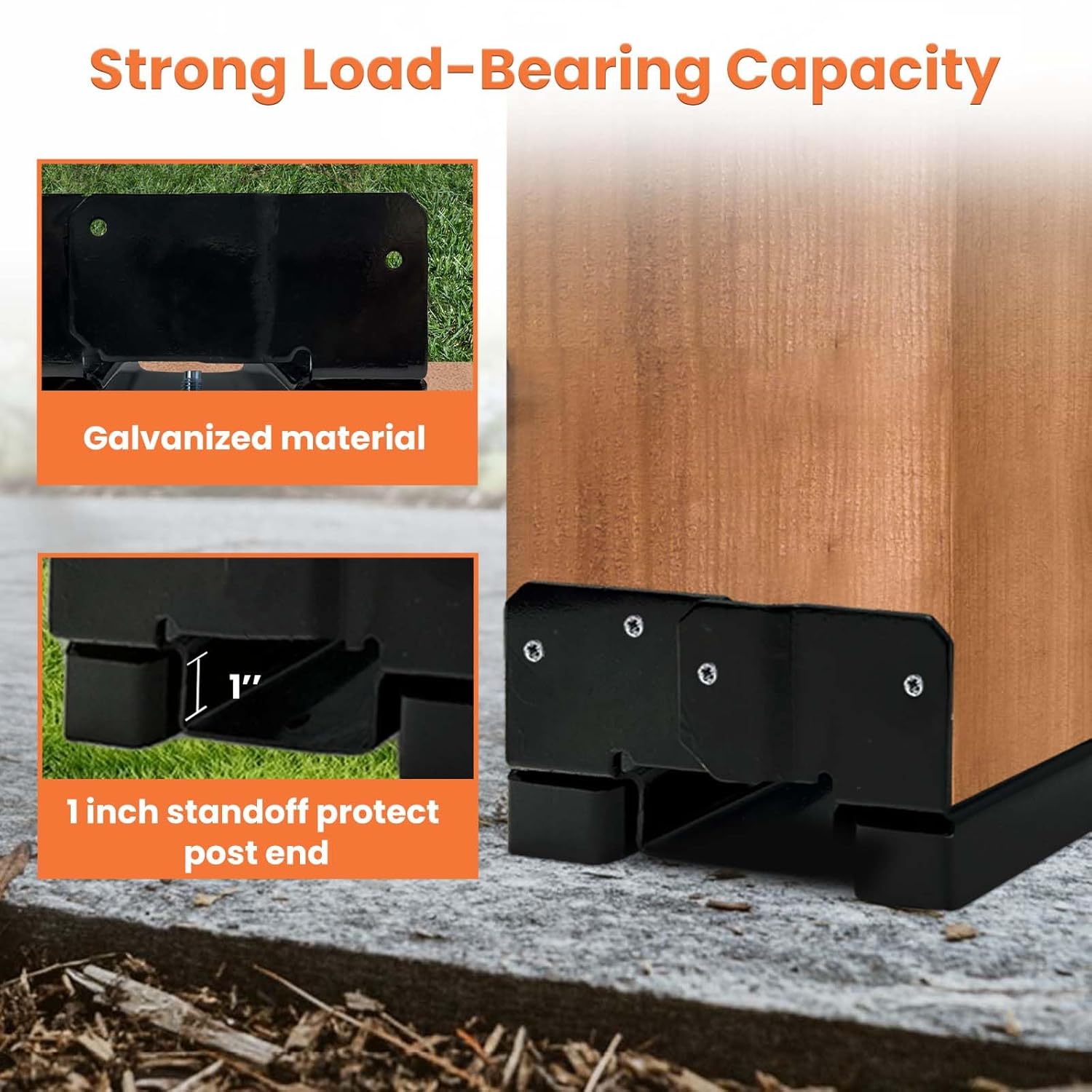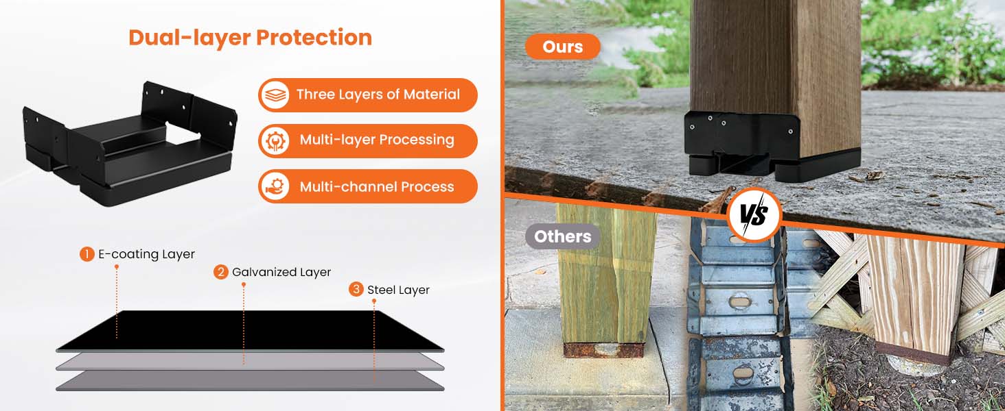 - 𝐂𝐨𝐫𝐫𝐨𝐬𝐢𝐨𝐧-𝐫𝐞𝐬𝐢𝐬𝐭𝐚𝐧𝐭 𝐄-𝐜𝐨𝐚𝐭𝐢𝐧𝐠: Each 8×8 post bracket is coated with black e-coating and galvanization, providing superior corrosion resistance and rust prevention.This dual-layer protection ensures a long lifespan while significantly reducing maintenance and replacement frequency.
