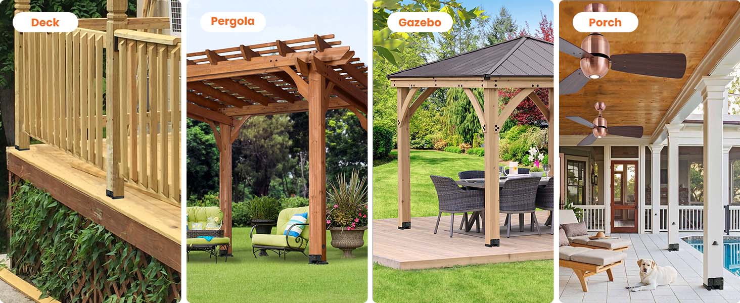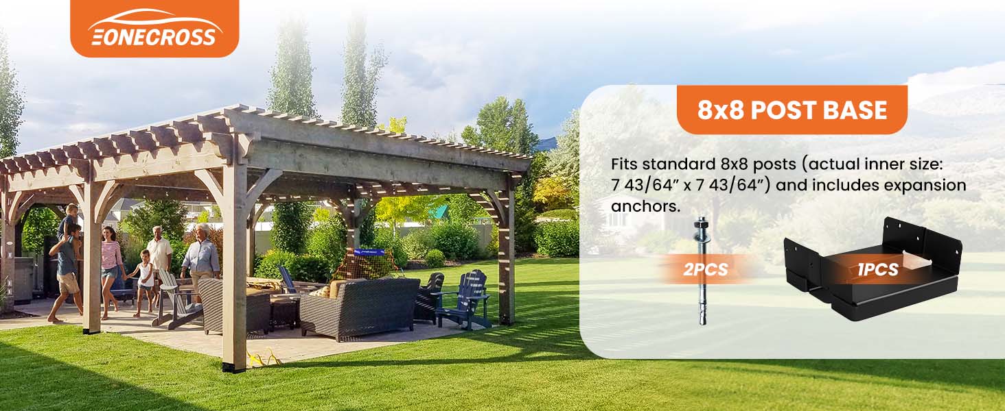 - 𝐅𝐢𝐭 7.5” 𝐱 7.5” 𝐏𝐨𝐬𝐭: Our 4 pcs black 8×8 post bases fit standard 8×8 posts (actual inner size: 7.5” x 7.5”).The deck post base is perfect for a range of spaces,indluding decks,pergolas,patios,gazebos,proches.