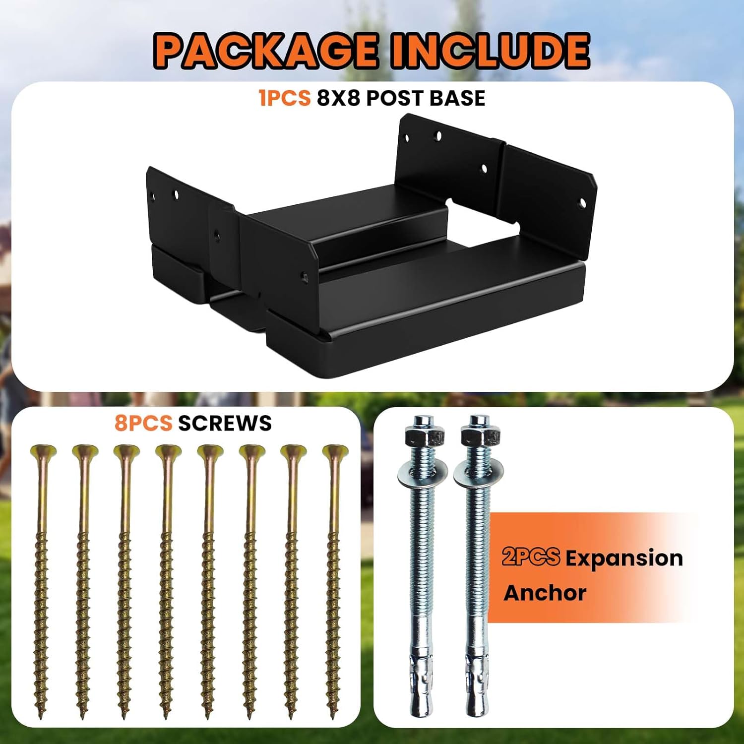 - 𝐏𝐚𝐜𝐤𝐚𝐠𝐞 𝐈𝐧𝐜𝐥𝐮𝐝𝐞𝐝: The package comes with expansion anchors,self-tapping screws,8×8 post bases,and an instruction manual.
