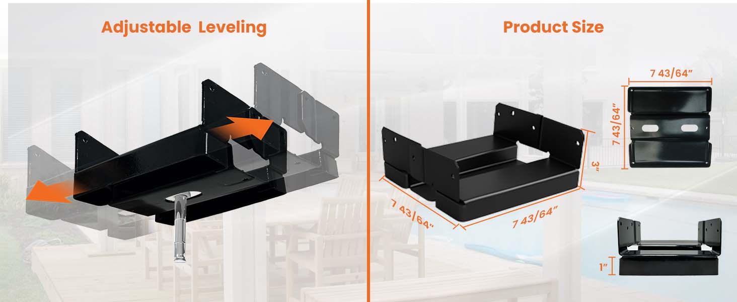 - 𝐔𝐧𝐢𝐪𝐮𝐞 𝐃𝐞𝐬𝐢𝐠𝐧 & 𝐄𝐚𝐬𝐲 𝐈𝐧𝐬𝐭𝐚𝐥𝐥𝐚𝐭𝐢𝐨𝐧: Compared with other 8×8 post anchors,our post anchor features a 1″ standoff from the ground,effectively preventing rot and infestation.Additionally,the adjustable level design of our 8×8 pergola bracket kit makes installation easier,saveing time and effort.