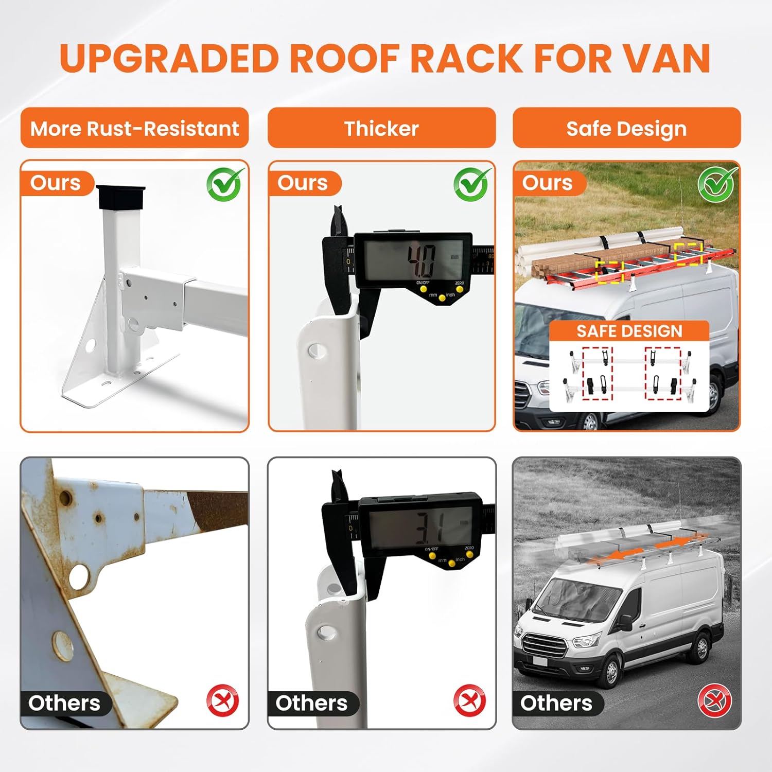 - 【𝐓𝐨𝐮𝐠𝐡 𝐋𝐨𝐚𝐝 𝐑𝐚𝐜𝐤】.This van ladder rack for ford transit is made of durable alloy steel with a white powder-coated finish. It’s rust resistant, corrosion proof, and built to withstand harsh weather. The rugged structure supports up to 500 lbs and remains strong and reliable even after years of use.