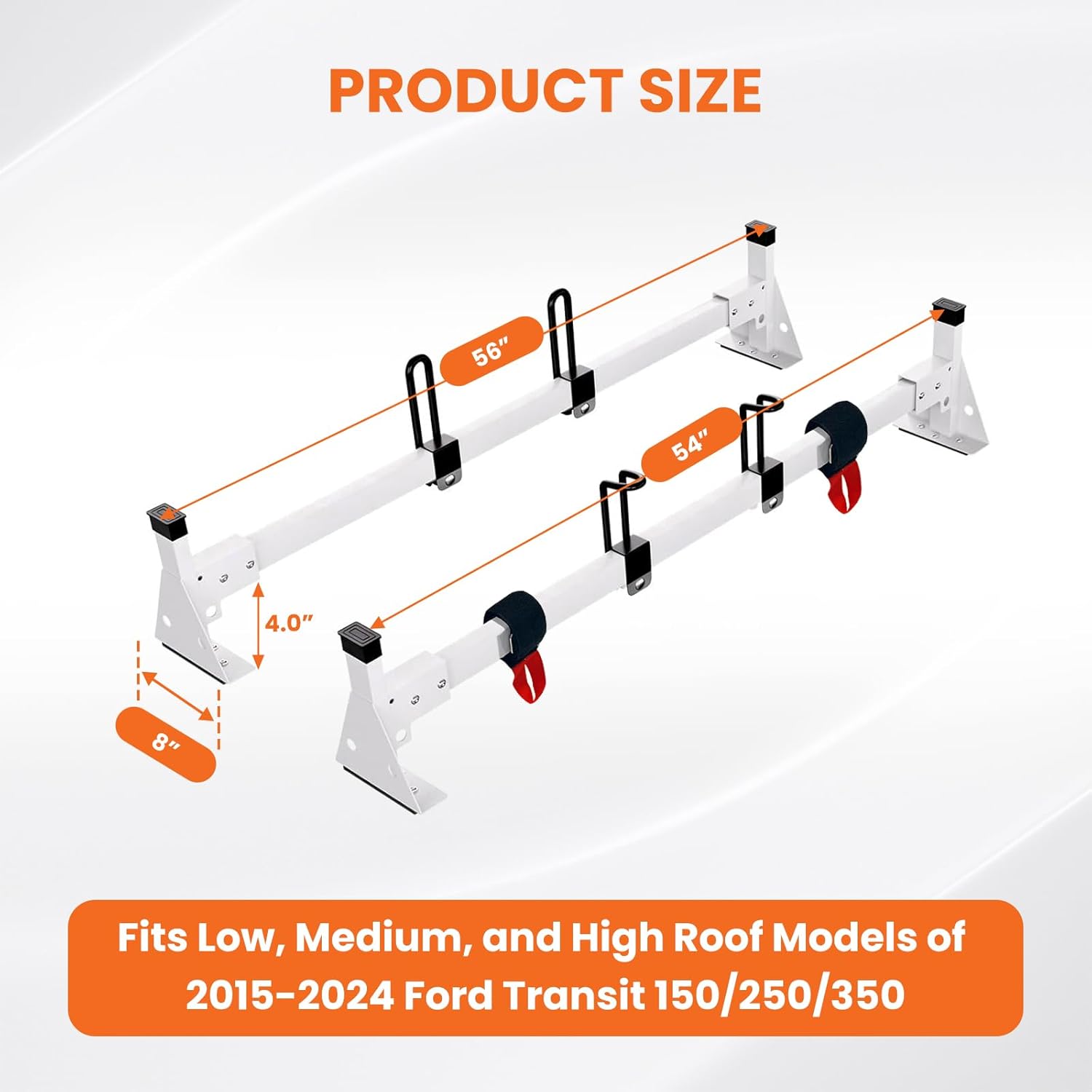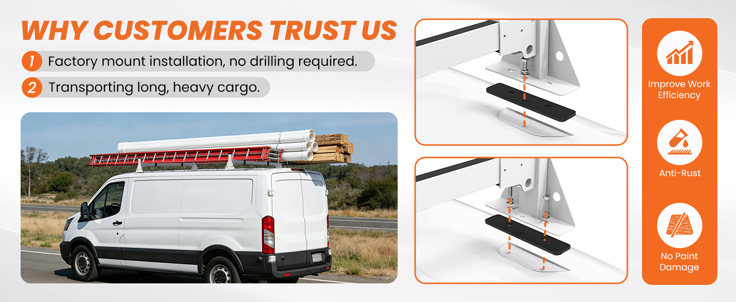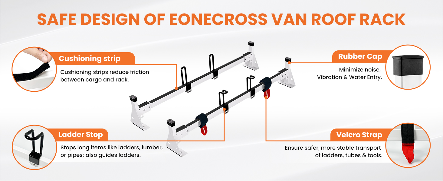 - 【𝐒𝐞𝐜𝐮𝐫𝐞 & 𝐐𝐮𝐢𝐞𝐭 𝐓𝐫𝐚𝐧𝐬𝐩𝐨𝐫𝐭】.EONECROSS Van Ladder Rack features reinforced rails and stoppers to keep cargo firmly secured. Rubber caps eliminate wind noise for quiet highway driving. Dual nylon straps, stoppers, and anti-skid tape prevent any shifting. Designed for secure, silent transport – no rattling even on rough roads.