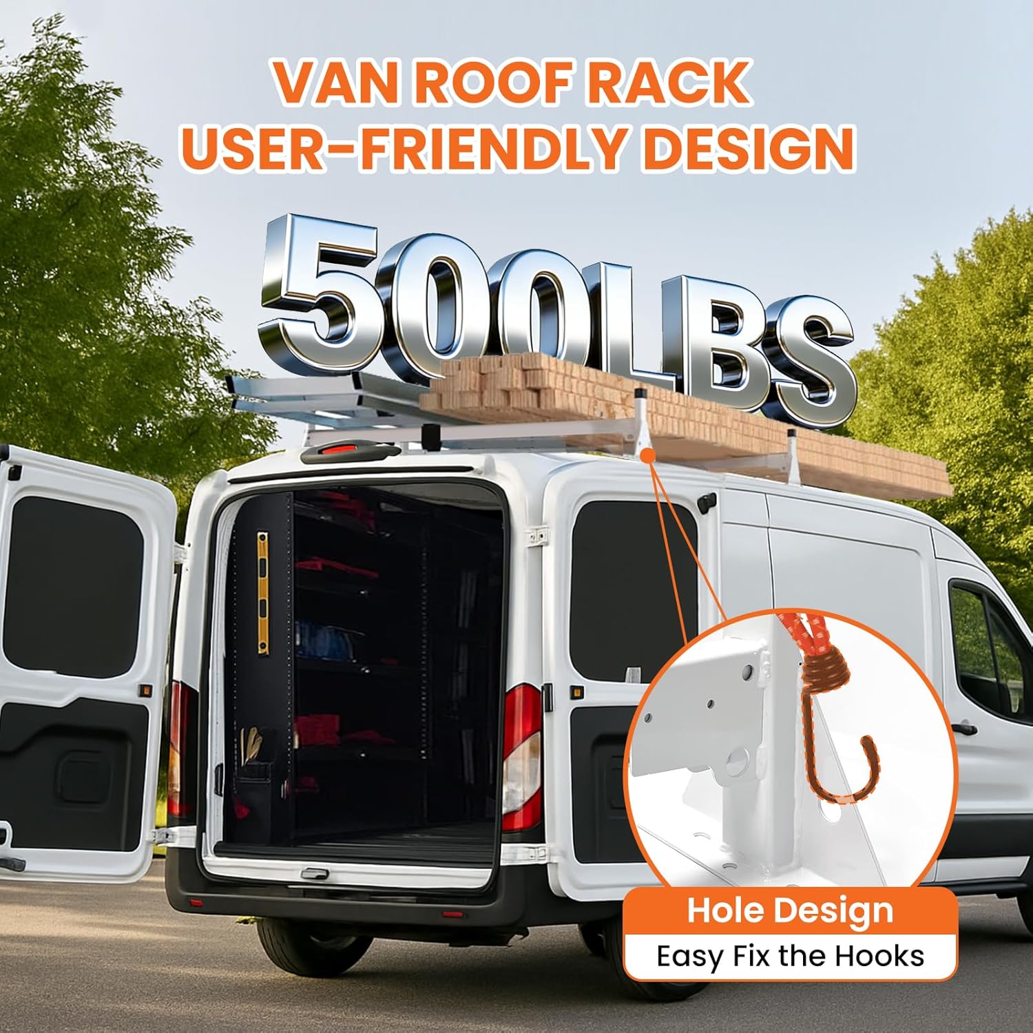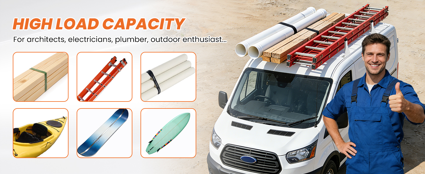 - 【𝐌𝐮𝐥𝐭𝐢𝐩𝐥𝐞 𝐔𝐬𝐞𝐬】.Van roof rack is perfect for safely carrying ladders, lumber, pipes, canoes, pool equipment, and other long or heavy items—an ideal solution for hauling bulky cargo on your van roof.