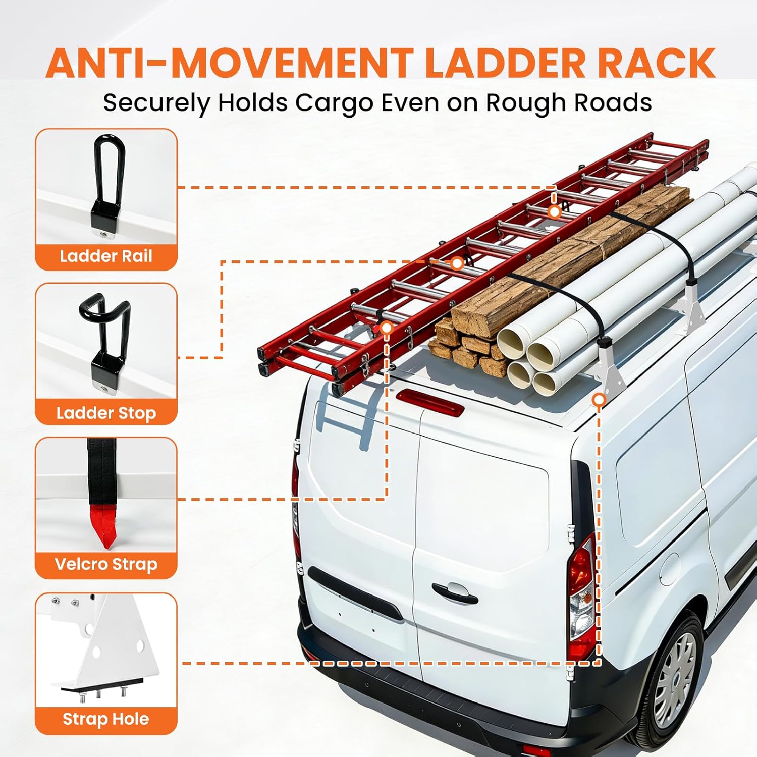 We manufacture this ladder rack from high-strength steel and finish it with a durable white powder coating. This protective layer resists rust, corrosion, and harsh weather exposure.