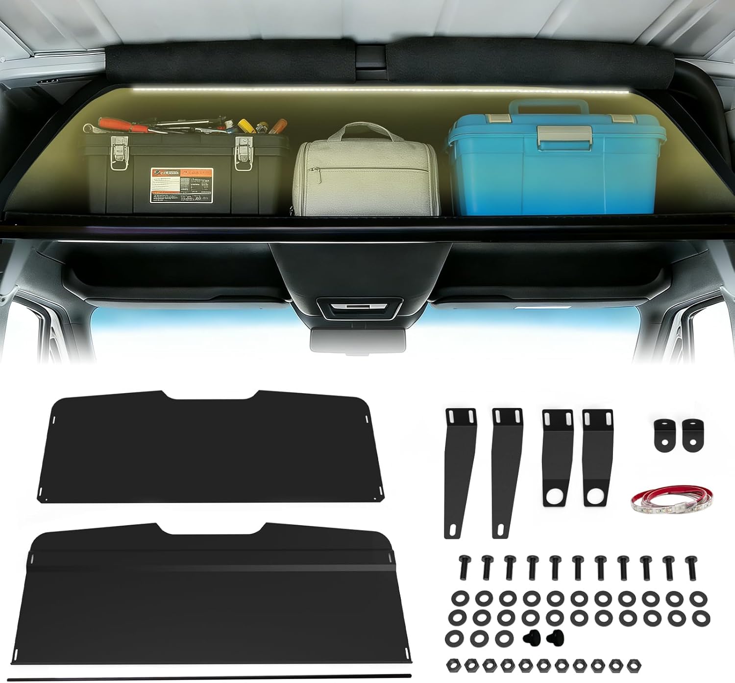 The upgraded version of the Sprinter van headliner shelf includes integrated LED strip lights that illuminate the storage area.