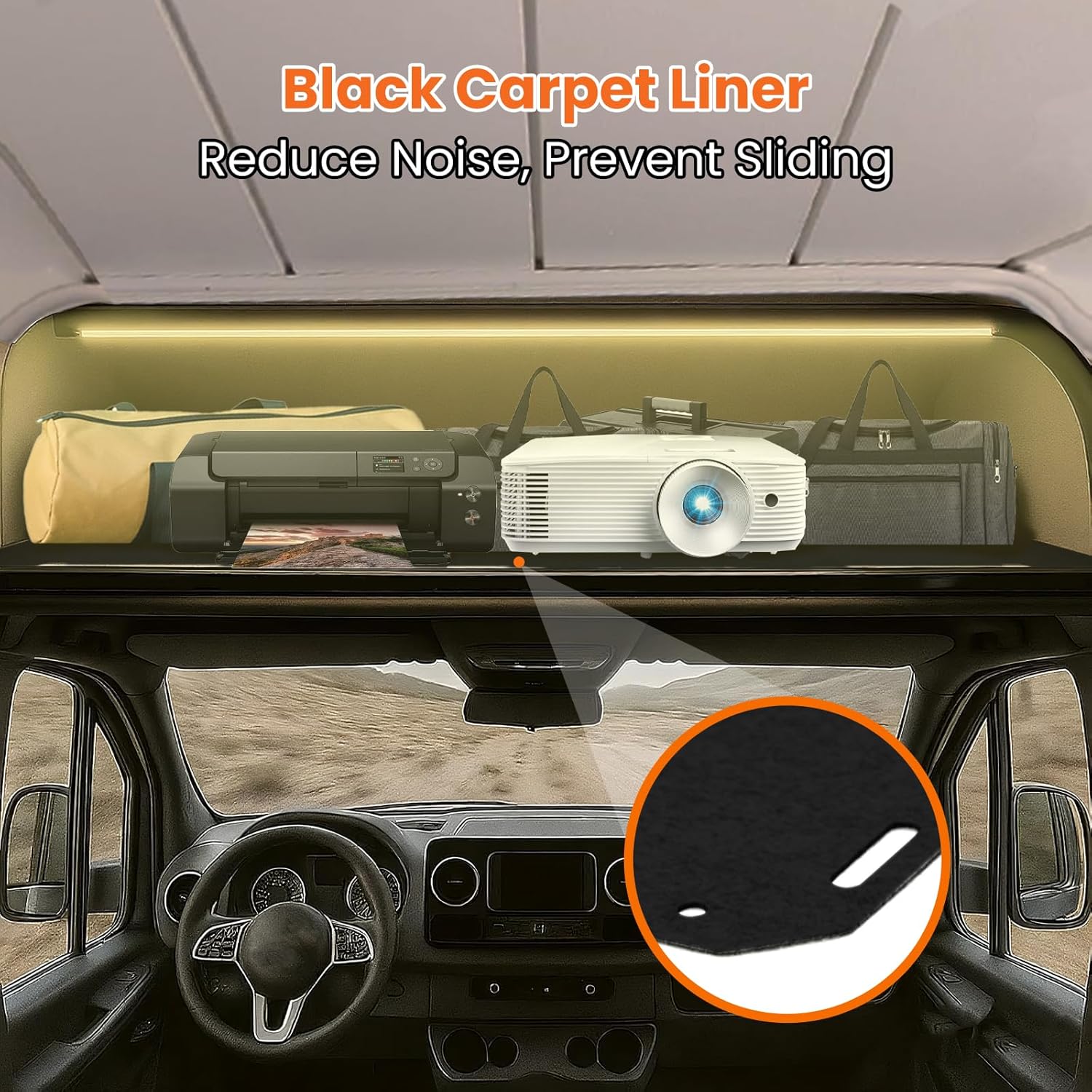 The storage surface of the Sprinter van headliner shelf features a soft carpet liner that protects your belongings and improves driving comfort.