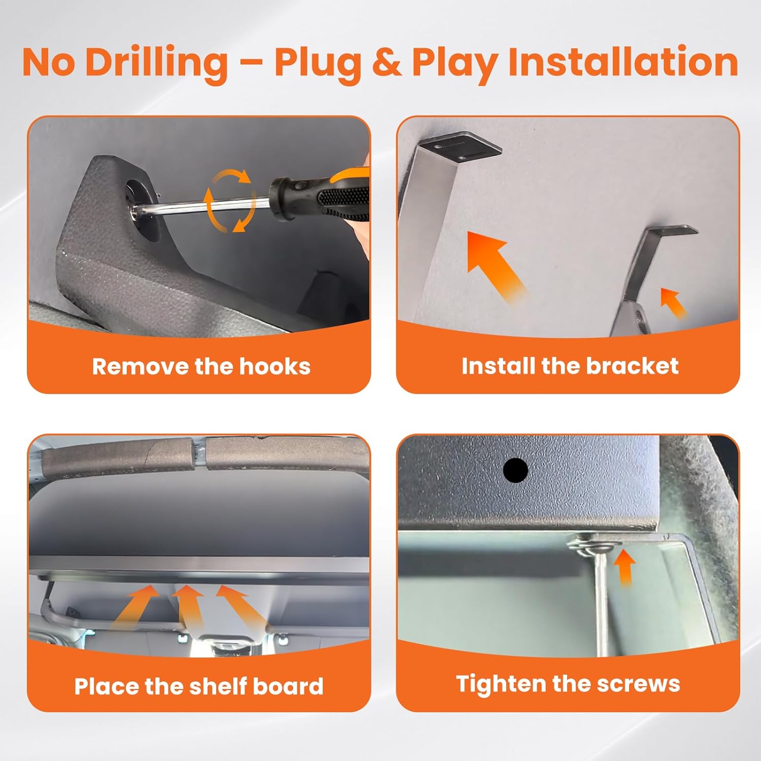 A: No. The shelf installs using factory mounting points and does not require drilling or vehicle modification.